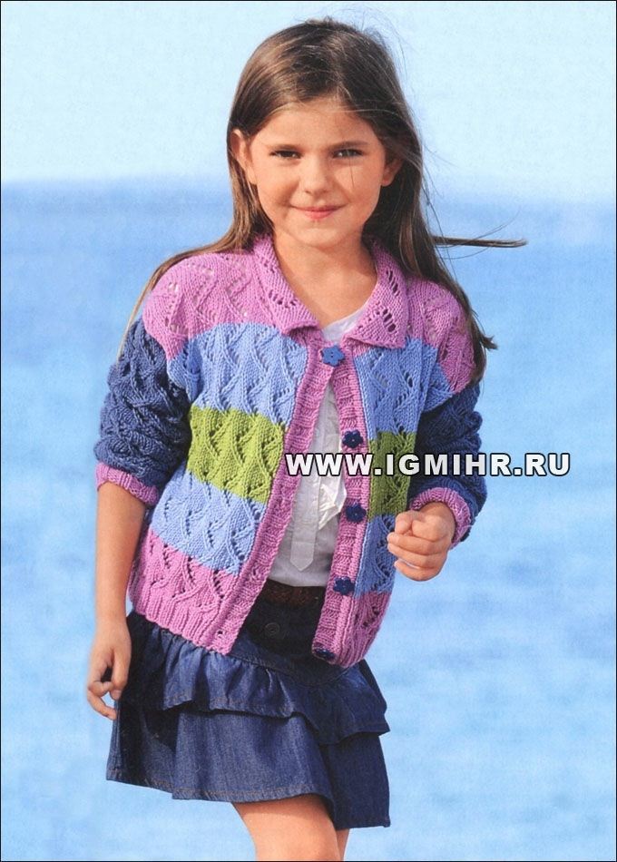 Спинка. Ярко-розовой нитью набрать на спицы 70 (78) 86 п. и вязать пояс резинкой 3 см, при этом в последнем ряду прибавить, равномерно распределив, 2 (1) 0 п. Далее вязать между кром. п. ажурным узором, начав у стрелки А, при этом вязать 4 (5) 6 см ярко-розовой нитью, далее по 7 (8) 9 см голубой, светло-зеленой, голубой и ярко-розовой нитью. Через 30 (35) 40 см от пояса закрыть для горловины средние 16 (21) 24 п. Плечи закончить раздельно, при этом по краю горловины закрыть во 2-м р. 1 х 2 п. Через 32 (37) 42 см от пояса закрыть прямо оставшиеся петли плеча.